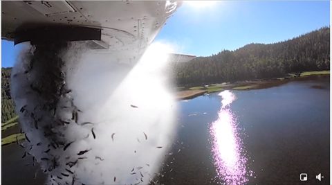 車両では行けない高地の湖およそ200カ所に、飛行機で放流を行ったと同局は報告。水面に向かって飛行機から魚が放たれていく様子はなんとも豪快です。1950年代半ばから実施している効果的な放流方法だとしています。
