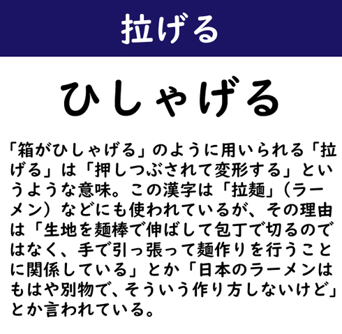 「箱がひしゃげる」のように用いられる「拉げる」は「押しつぶされて変形する」というような意味。この漢字は「拉麺」(ラーメン)などにも使われているが、その理由は「生地を麺棒で伸ばして包丁で切るのではなく、手で引っ張って麺作りを行うことに関係している」とか「日本のラーメンはもはや別物で、そういう作り方しないけど」とか言われている。