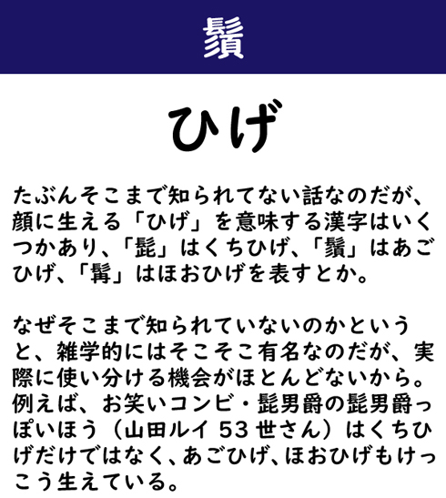 たぶんそこまで知られてない話なのだが、顔に生える「ひげ」を意味する漢字はいくつかあり、「髭」はくちひげ、「鬚」はあごひげ、「髯」はほおひげを表すとか。なぜそこまで知られていないのかというと、雑学的にはそこそこ有名なのだが、実際に使い分ける機会がほとんどないから。例えば、お笑いコンビ・髭男爵の髭男爵っぽいほう(山田ルイ53世さん)はくちひげだけではなく、あごひげ、ほおひげもけっこう生えている。