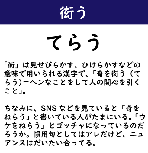 「衒」は見せびらかす、ひけらかすなどの意味で用いられる漢字で、「奇を衒う(てらう)=ヘンなことをして人の関心を引くこと」。ちなみに、SNSなどを見ていると「奇をねらう」と書いている人がたまにいる。「ウケをねらう」とゴッチャになっているのだろうか。慣用句としてはアレだけど、ニュアンスはだいたい合ってる。