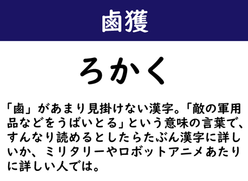「鹵」があまり見掛けない漢字。「敵の軍用品などをうばいとる」という意味の言葉で、すんなり読めるとしたらたぶん漢字に詳しいか、ミリタリーやロボットアニメあたりに詳しい人では。