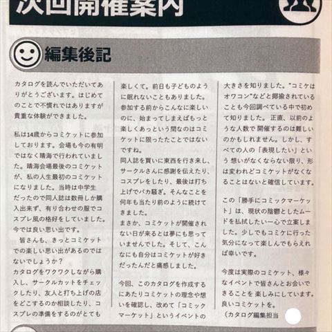 編集後記にはコミケに参加したときの思い出、開催中止になったことでこんなにもコミケが好きだったと痛感したことなどがつづられています。「すべての人の『表現したい』という想いがなくならない限り、形は変われどコミケットがなくなることはないと確信しています」というコメントが熱い……!