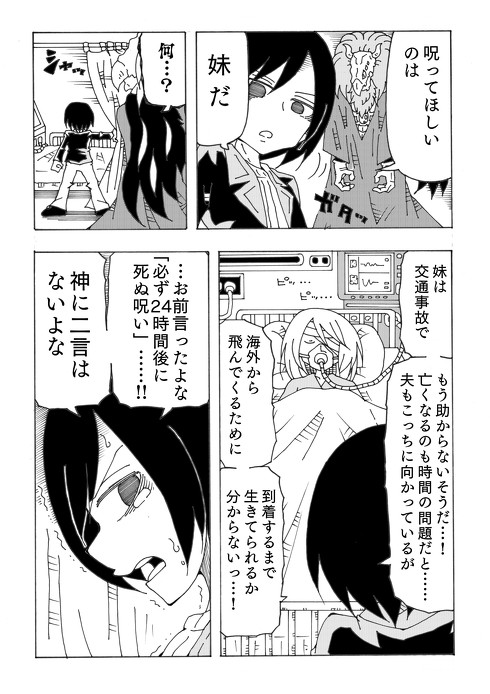男が呪ってほしい相手は「妹」でした。彼が死神を召喚した場所は病院の一室。妹は交通事故で重体となり、海外出張中の夫が帰ってくるまで生きていられるかも分からない状態にありました。