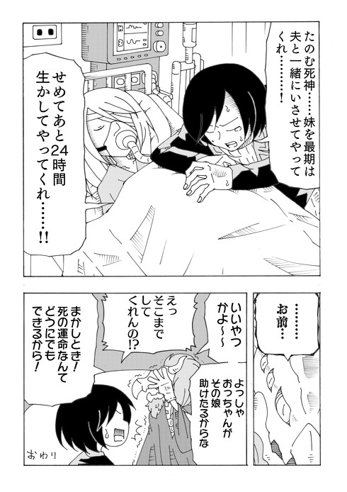 対する死神の返事はというと……。1ページ目からは想像もつかないハッピーエンドに、Twitterでは「やさしい世界」「死神のおっちゃん好き!」と明るい感想が寄せられています。