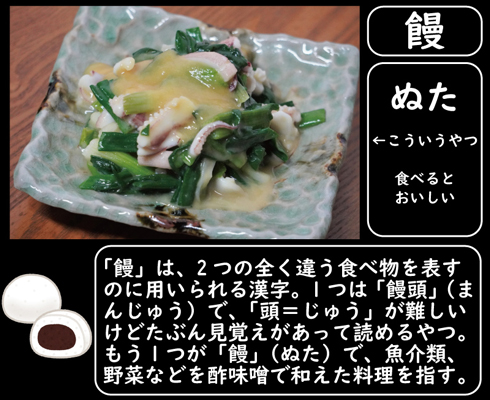 「饅」は、2つの全く違う食べ物を表すのに用いられる漢字。1つは「饅頭」(まんじゅう)で、「頭=じゅう」が難しいけどたぶん見覚えがあって読めるやつ。もう1つが「饅」(ぬた)で、魚介類、野菜などを酢味噌で和えた料理を指す。