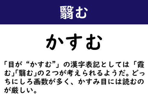 「目が“かすむ”」の漢字表記としては「霞む」「翳む」の2つが考えられるようだ。どっちにしろ画数が多く、かすみ目には読むのが厳しい。