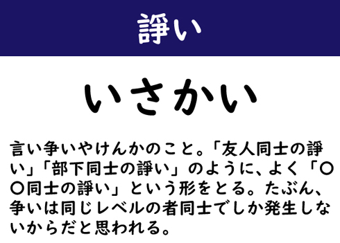 言い争いやけんかのこと。「友人同士の諍い」「部下同士の諍い」のように、よく「〇〇同士の諍い」という形になる。おそらく、争いは同じレベルの者同士でしか発生しないためだと思われる。