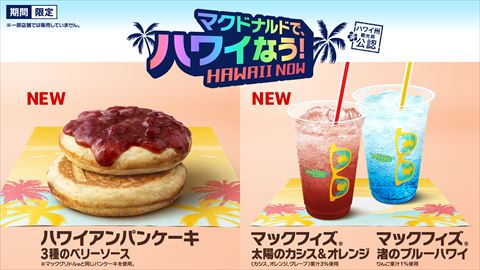 メイプルシロップ入りパンケーキに、カシス果汁とストロベリーとクランベリーの果肉が入ったソースをかけた「ハワイアンパンケーキ3種のベリーソース」(290円)、「マックフィズ/マックフロート渚のブルーハワイ」「マックフィズ/マックフロート太陽のカシス&オレンジ」も登場します(フィズは250円、フロートは310円)。