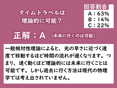 一般相対性理論によると、光の早さに近づく速度で移動するほど時間の流れが遅くなります。つまり、速く動くほど理論的には未来に行くことは可能です。しかし過去に行く方法は現代の物理学では考え出されていません。