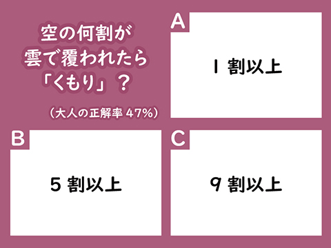 【前回のテーマ】大人の正解率47%:空の何割が雲で覆われたら「くもり」?