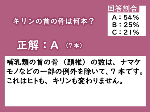 哺乳類の首の骨(頚椎)の数は、ナマケモノなどの一部の例外を除いて、7本です。これはヒトも、キリンも変わりません。