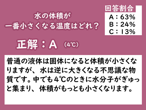 - 【前回のテーマ】大人の正解率63%:水の体積が一番小さくなる温度はどれ?