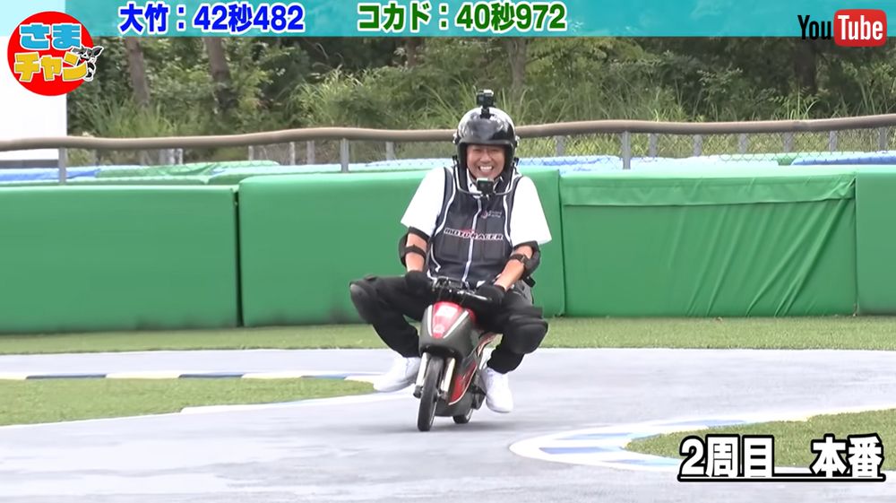 まずは大竹さんがコースイン。慣れないバイクの運転に「怖いな」といいつつ無難にまとめてゴール。タイムは42秒482でした。「初めてにしてはけっこう速い」とスタッフさん。続いてコカドさんもスタート。コカドさんはもっとうまくてタイムは40秒972。あっさり抜かれて「やっべぇな」とホントに罰ゲームだけは嫌な大竹さん。