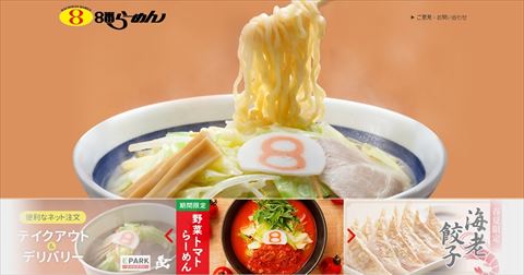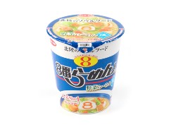 8番らーめんの特徴「野菜と太麺」に加え、人気メニュー「野菜らーめん塩味」を再現。スープが良く絡むちぢれ太麺に、チャーシュー、キャベツ、にんじん、もやし、8番らーめんのシンボル「ハチカマ」が入っています。