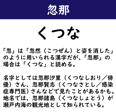 「忽」は「忽然(こつぜん)と姿を消した」のように用いられる漢字だが、「忽那」の場合は「くつな」と読める。名字としては忽那汐里(くつなしおり/俳優)さん、忽那賢志(くつなさとし/感染症専門医)さんなどで見たことがあるかも。地名では、忽那諸島(くつなしょとう)が瀬戸内海の観光地として知られている。