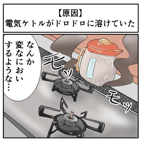 以前、コンロの奥側に電気ケトルを置いたまま、魚焼きグリルを使用したことが。焦げくさい臭いがしたのですが、魚を焼いているところだったので、気にせず調理を続けていました。