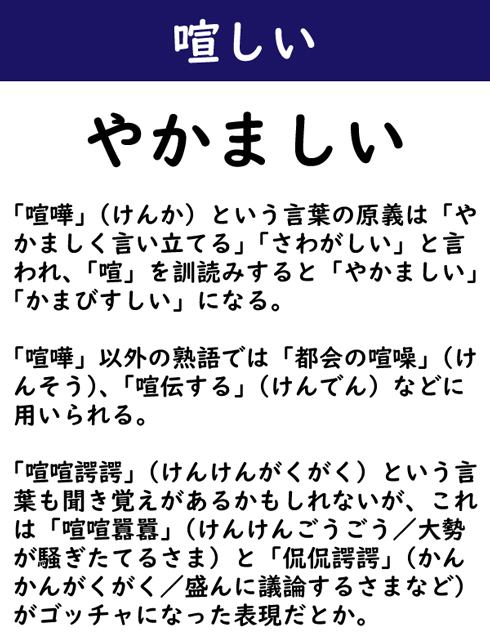 「喧嘩」(けんか)という言葉の原義は「やかましく言い立てる」「さわがしい」と言われ、「喧」を訓読みすると「やかましい」「かまびすしい」になる。「喧嘩」以外の熟語では「都会の喧噪」(けんそう)、「喧伝する」(けんでん)などに用いられる。「喧喧諤諤」(けんけんがくがく)という言葉も聞き覚えがあるかもしれないが、これは「喧喧囂囂」(けんけんごうごう/大勢が騒ぎたてるさま)と「侃侃諤諤」(かんかんがくがく/盛んに議論するさまなど)がゴッチャになった表現だとか。