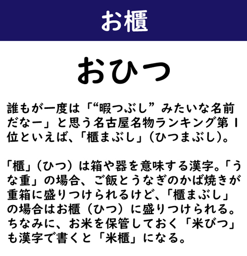 誰もが一度は「“暇つぶし”みたいな名前だなー」と思う名古屋名物ランキング第1位といえば、「櫃まぶし」(ひつまぶし)。「櫃」(ひつ)は箱や器を意味する漢字。「うな重」の場合、ご飯とうなぎのかば焼きが重箱に盛りつけられるけど、「櫃まぶし」の場合はお櫃(ひつ)に盛りつけられる。ちなみに、お米を保管しておく「米びつ」も漢字で書くと「米櫃」になる。