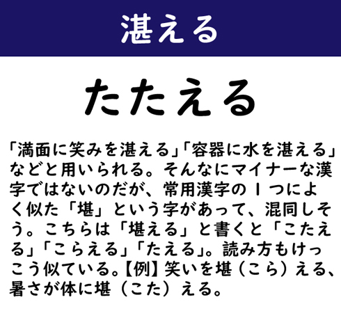 「満面に笑みを湛える」「容器に水を湛える」などと用いられる。そんなにマイナーな漢字ではないのだが、常用漢字の1つによく似た「堪」という字があって、混同しそう。こちらは「堪える」と書くと「こたえる」「こらえる」「たえる」。読み方もけっこう似ている。【例】笑いを堪(こら)える、暑さが体に堪(こた)える。