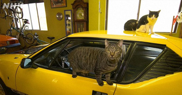 それにしても「どうよ?」と運転席から自慢するようにキめたにゃんこの真剣な表情、そしてルーフに乗ったお友達(?)2匹のおくつろぎ具合がかわいすぎます。ホントのオーナーの「あぁぁーボディーに傷ついちゃうよ……。でも仕方ないか」といった心の声も聞こえてきそうですが、この安心しきったにゃんこたちの表情からこれが多分日常なんでしょう。ほんわか。