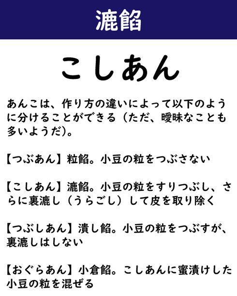 【こしあん】漉餡。小豆の粒をすりつぶし、さらに裏漉し(うらごし)して皮を取り除く。