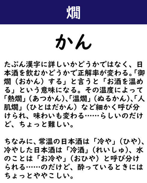 たぶん漢字に詳しいかどうかではなく、日本酒を飲むかどうかで正解率が変わる。「御燗(おかん)する」と言うと「お酒を温める」という意味になる。その温度によって「熱燗」(あつかん)、「温燗」(ぬるかん)、「人肌燗」(ひとはだかん)など細かく呼び分けられ、味わいも変わる……らしいのだけど、ちょっと難しい。ちなみに、常温の日本酒は「冷や」(ひや)、冷やした日本酒は「冷酒」(れいしゅ)、水のことは「お冷や」(おひや)と呼び分けられる……のだけど、酔っているときにはちょっとややこしい。