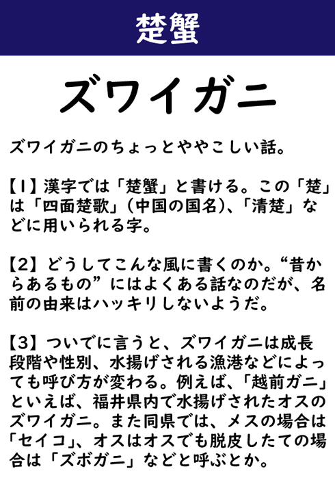 【3】ついでに言うと、ズワイガニは成長段階や性別、水揚げされる漁港などによっても呼び方が変わる。例えば、「越前ガニ」といえば、福井県内で水揚げされたオスのズワイガニ。また同県では、メスの場合は「セイコ」、オスはオスでも脱皮したての場合は「ズボガニ」などと呼ぶとか。