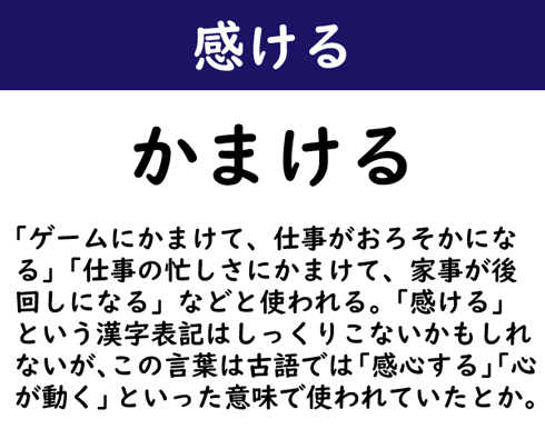 「ゲームにかまけて、仕事がおろそかになる」「仕事の忙しさにかまけて、家事が後回しになる」などと使われる。「感ける」という漢字表記はしっくりこないかもしれないが、この言葉は古語では「感心する」「心が動く」といった意味で使われていたとか。