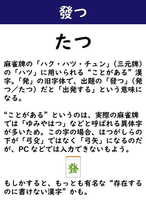 麻雀牌の「ハク・ハツ・チュン」(三元牌)の「ハツ」に用いられる“ことがある”漢字。「発」の旧字体で、出題の「發つ」(発つ/たつ)だと「出発する」という意味になる。“ことがある”というのは、実際の麻雀牌では「ゆみやはつ」などと呼ばれる異体字が多いため。この字の場合、はつがしらの下が「弓殳」ではなく「弓矢」になるのだが、PCなどでは入力できないもよう。もしかすると、もっとも有名な“存在するのに書けない漢字”かも。
