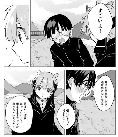 コノミはマホイが壊そうな男たちを魔法でやっつけるのを見てファンになったと言うのですが、それは勘違い。やっつけたのはマホイの友達でした。それでもコノミは、「魔法が使えないのに逃げ出さないのはすごい」と褒めます。彼はその場にいたのに何もできなかった自分を「臆病」だと言い、マホイの姿を見て勇気をもらったと話します。