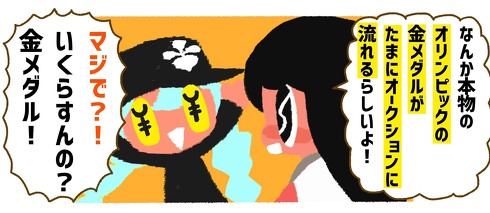 「金メダルザックザクほちイー!!」と海賊のようなことを言い出したギャルちゃん。過去には金メダルがオークションに出品された例があり、ザックザクは無理でも1枚くらいなら手に入れるチャンスはあるかもしれません。