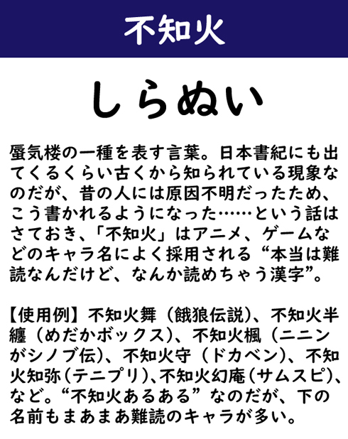 【使用例】不知火舞(餓狼伝説)、不知火半纏(めだかボックス)、不知火楓(ニニンがシノブ伝)、不知火守(ドカベン)、不知火知弥(テニプリ)、不知火幻庵(サムスピ)、など。“不知火あるある”なのだが、下の名前もまあまあ難読のキャラが多い。
