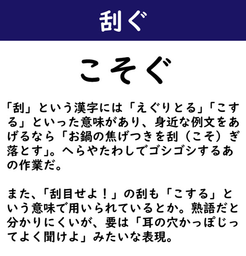「刮」という漢字には「えぐりとる」「こする」といった意味があり、身近な例文をあげるなら「お鍋の焦げつきを刮(こそ)ぎ落とす」。へらやたわしでゴシゴシするあの作業だ。また、「刮目せよ!」の刮も「こする」という意味で用いられているとか。熟語だと分かりにくいが、要は「耳の穴かっぽじってよく聞けよ」みたいな表現。