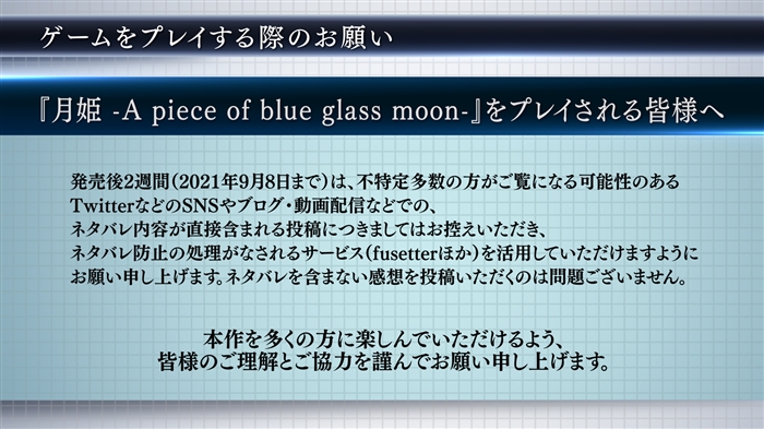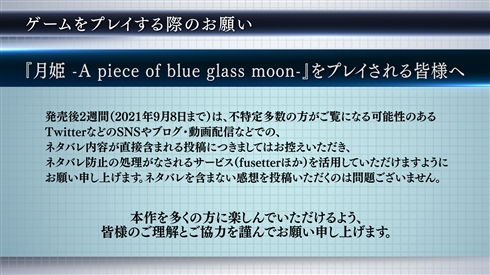 いよいよ8月26日に発売となる、伝奇ビジュアルノベル「月姫 -A piece of blue glass moon-」(PS4/Nintendo Switch)。作品公式Twitterアカウントが、発売後2週間のネタバレ配慮を求める声明を公開しました。