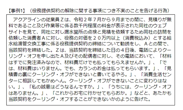 悪質な行為の例として、同社がクーリングオフを求めた客に対し「材料はすでに発注済みなので、材料費だけでも払ってもらえませんか」「見積書の裏にクーリング・オフができないと書いてるやろ。ちゃんと読んでもらってますか」「消費生活センターに相談してもかめへん。クーリング・オフができないことに変わりはない」「これからお宅に行かせてもらおか」などと、契約解除を妨げていたことが挙げられています。