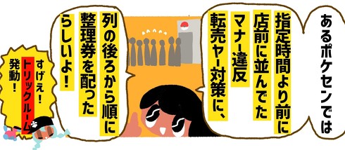 しかし、お店側も黙っていません。あるポケモンセンターは指定時間より前に並ぶ転売ヤーを対策するため、列の後ろ側から順に整理券を配る荒業で注目を集めました。トリックルームですばやさ逆転しとる!