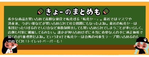 最近ではマスクや消毒液、うがい薬などが買い占められて社会問題にもなりました。どんなものであれ、本当に必要な人の手に適正価格で届く世の中になってほしいものです。というか転売ヤーは台風の時に養生テープ買い占めるのやめてくれ! トイレットペーパーも!