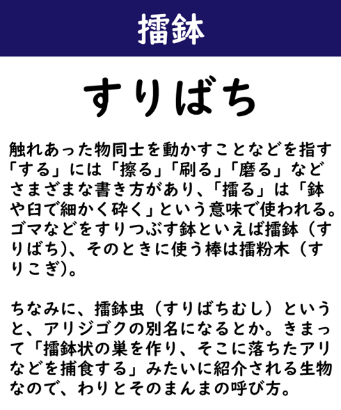 触れあった物同士を動かすことなどを指す「する」には「擦る」「刷る」「磨る」などさまざまな書き方があり、「擂る」は「鉢や臼で細かく砕く」という意味で使われる。ゴマなどをすりつぶす鉢といえば擂鉢(すりばち)、そのときに使う棒は擂粉木(すりこぎ)。ちなみに、擂鉢虫(すりばちむし)というと、アリジゴクの別名になるとか。きまって「擂鉢状の巣を作り、そこに落ちたアリなどを捕食する」みたいに紹介される生物なので、わりとそのまんまの呼び方。