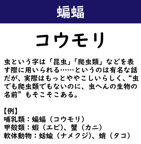 虫という字は「昆虫」「爬虫類」などを表す際に用いられる……というのは有名な話だが、実際はもっとややこしいらしく、“虫でも爬虫類でもないのに、虫へんの生物の名前”もそこそこある。例:哺乳類の蝙蝠(コウモリ)/甲殻類の蝦(エビ)、蟹(カニ)/軟体動物の蛞蝓(ナメクジ)、蛸(タコ)。