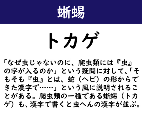 「なぜ虫じゃないのに、爬虫類には『虫』の字が入るのか」という疑問に対して、「そもそも『虫』とは、蛇(ヘビ)の形からできた漢字で……」という風に説明されることがある。爬虫類の一種である蜥蜴(トカゲ)も、漢字で書くと虫へんの漢字が並ぶ。