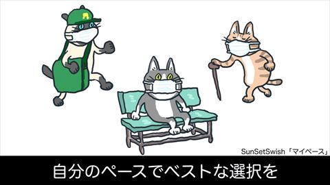 「SunSet Swish」のヒット曲「マイペース」をバックに、仕事猫が登場。