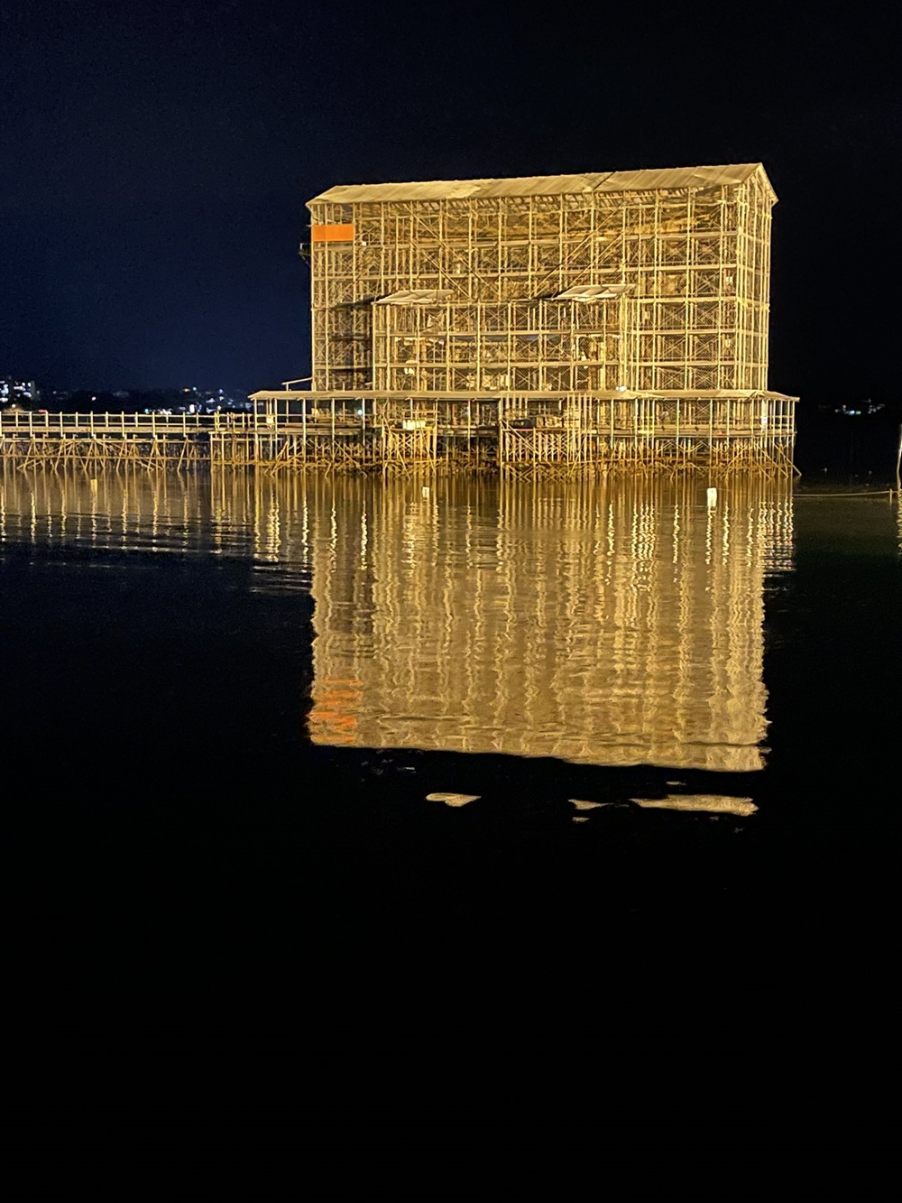 投稿された写真は大鳥居の周りをやぐらが取り囲んだ姿をライトアップしたものなのですが、宮大工さんたちによって丁寧に組まれた足場はなんともいえぬ美しさを放っており、それが水面に反射することによってより幻想的な一枚となっています。