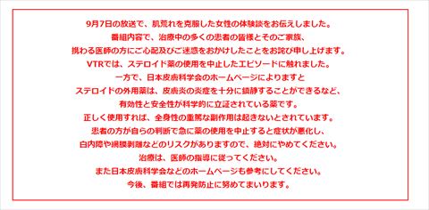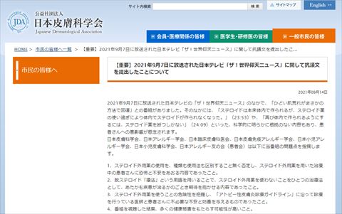 同学会が問題視したのは、9月7日に放送された、「脱ステロイド療法」で肌荒れが治ったとする体験談を紹介した内容。「ステロイド外用薬の使用を、種類も使用法も区別すること無く否定し、ステロイド外用薬を用いた治療中の患者さんに恐怖と不安をあおる内容であった」としています。