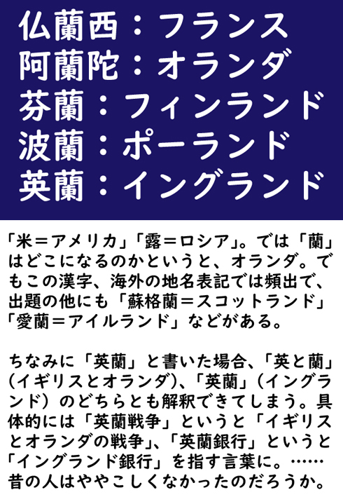 「米=アメリカ」「露=ロシア」。では「蘭」はどこになるのかというと、オランダ。でもこの漢字、海外の地名表記では頻出で、出題の他にも「蘇格蘭=スコットランド」「愛蘭=アイルランド」などがある。ちなみに「英蘭」と書いた場合、「英と蘭」(イギリスとオランダ)、「英蘭」(イングランド)のどちらとも解釈できてしまう。具体的には「英蘭戦争」というと「イギリスとオランダの戦争」、「英蘭銀行」というと「イングランド銀行」を指す言葉に。……昔の人はややこしくなかったのだろうか。