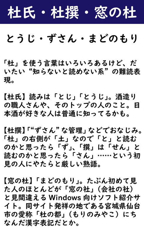 - 杜氏:とうじ/杜撰:ずさん/窓の杜:まどのもり