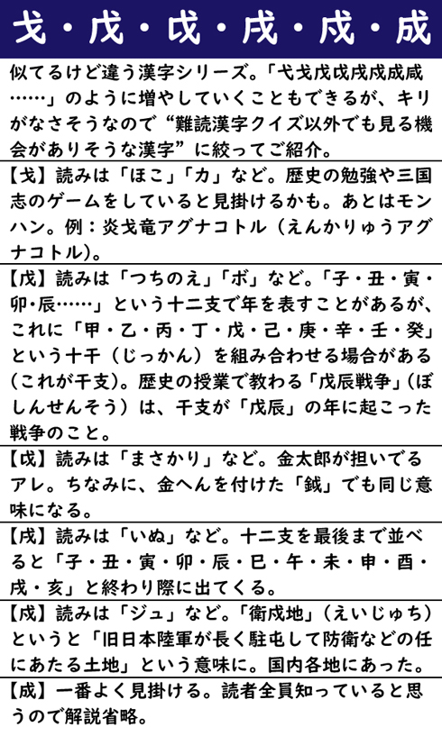 似てるけど違う漢字シリーズ。「弋戈戊戉戌戍成咸……」のように増やしていくこともできるが、キリがなさそうなので“難読漢字クイズ以外でも見る機会がありそうな漢字”に絞ってご紹介。