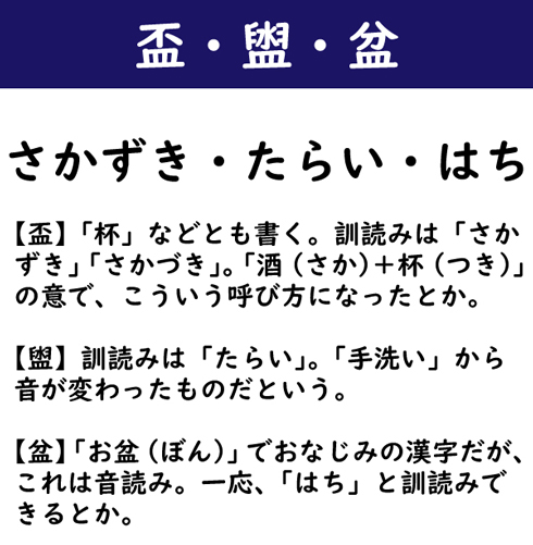 - 【前回の問題】「盃・盥・盆」の読み方は?(漢字1字で訓読み)