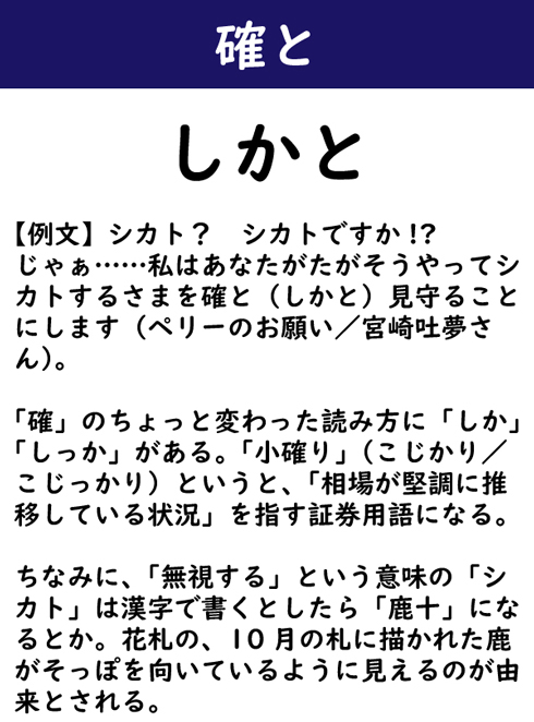 【例文】シカト? シカトですか!? じゃぁ……私はあなたがたがそうやってシカトするさまを確と(しかと)見守ることにします(ペリーのお願い/宮崎吐夢さん)。「確」のちょっと変わった読み方に「しか」「しっか」がある。「小確り」(こじかり/こじっかり)というと、「相場が堅調に推移している状況」を指す証券用語になる。ちなみに、「無視する」という意味の「シカト」は漢字で書くとしたら「鹿十」になるとか。花札の、10月の札に描かれた鹿がそっぽを向いているように見えるのが由来とされる。