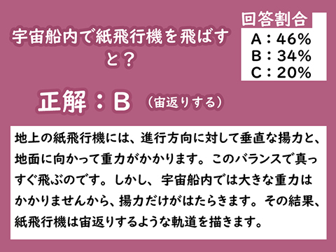 地上の紙飛行機には、進行方向に対して垂直な揚力と、地面に向かって重力がかかります。このバランスで真っすぐ飛ぶのです。しかし、宇宙船内では大きな重力はかかりませんから、揚力だけがはたらきます。その結果、紙飛行機は宙返りするような軌道を描きます。