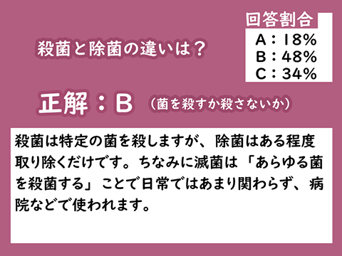 殺菌は特定の菌を殺しますが、除菌はある程度取り除くだけです。ちなみに滅菌は「あらゆる菌を殺菌する」ことで日常ではあまり関わらず、病院などで使われます。